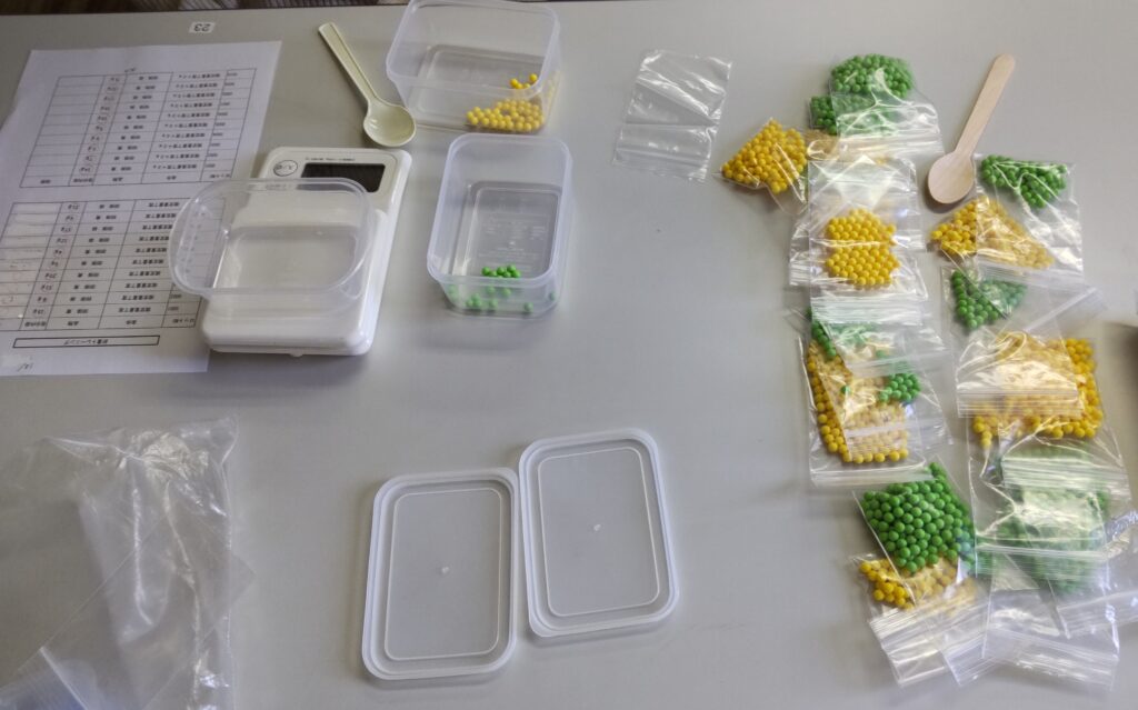指示書に書かれた決められた量(例:黄色○g、緑色△g)を、正確に測って袋に入れる必要があります。重さ間違えないように集中して取り組むことで、業務の正確性と持続的な集中力が鍛えられます。