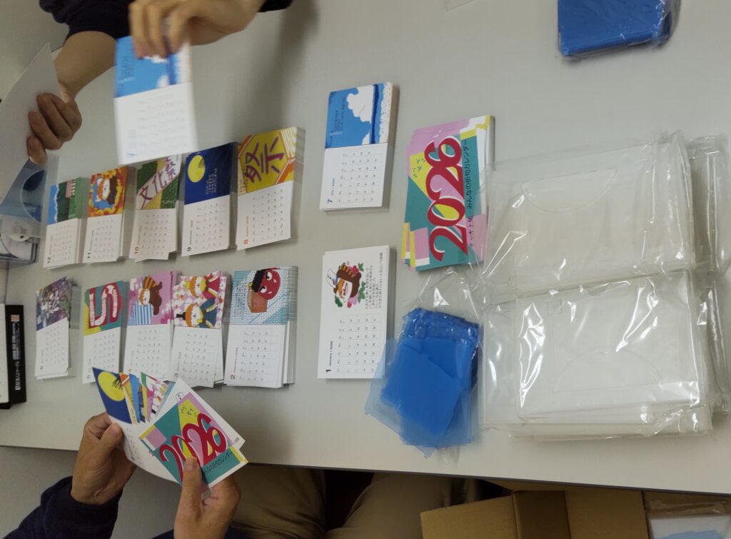 印刷が出来上がったカレンダーは、いよいよ皆さまの元へお届けするためのパッキング作業へ。 今回は、以下の工程を利用者さん同士で協力して進めました。